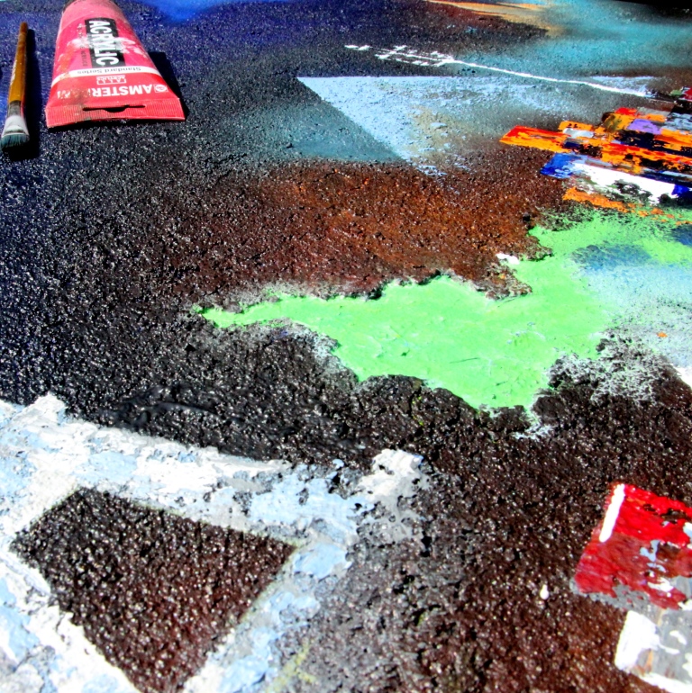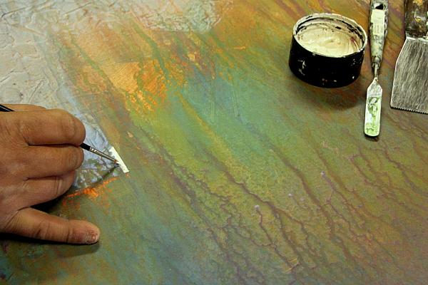 In the saturated sand layer technique, the canvas is at first treated with sand. After a layer of gesso and black paint, the sand will be strawed on the canvas. With plenty of water and a little paint (in various colors) the sand layer will be saturated. The water evaporates out of the sand layer, the paint dries on between the pores. If the sand layer is saturated completely, the image will be painted with palette knife or brush on the layer. Sometimes coffee or glass will be added to the sand layer.